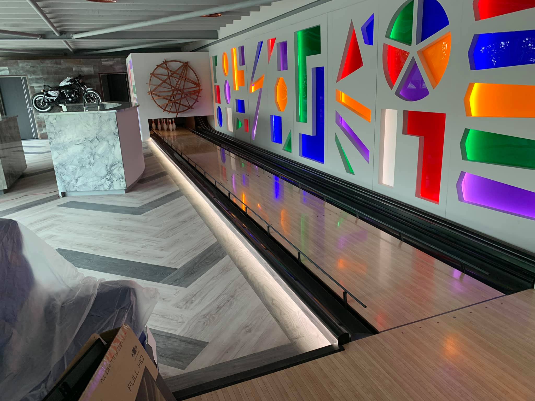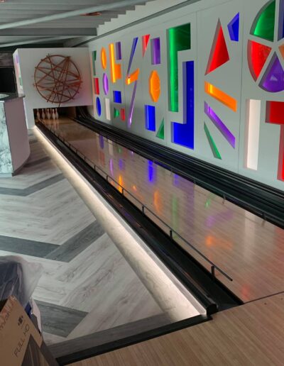 We installed a single-lane system with full string pinsetter technology, LED lighting, automatic bumpers, precision ball returns, and complete scoring systems. What made this project particularly unique was our role in designing and constructing the LED wall that runs throughout the leisure space. This bespoke lighting feature creates a cohesive visual experience, linking the bowling area with the cinema and social spaces—transforming the environment from daytime family fun to sophisticated evening entertainment.